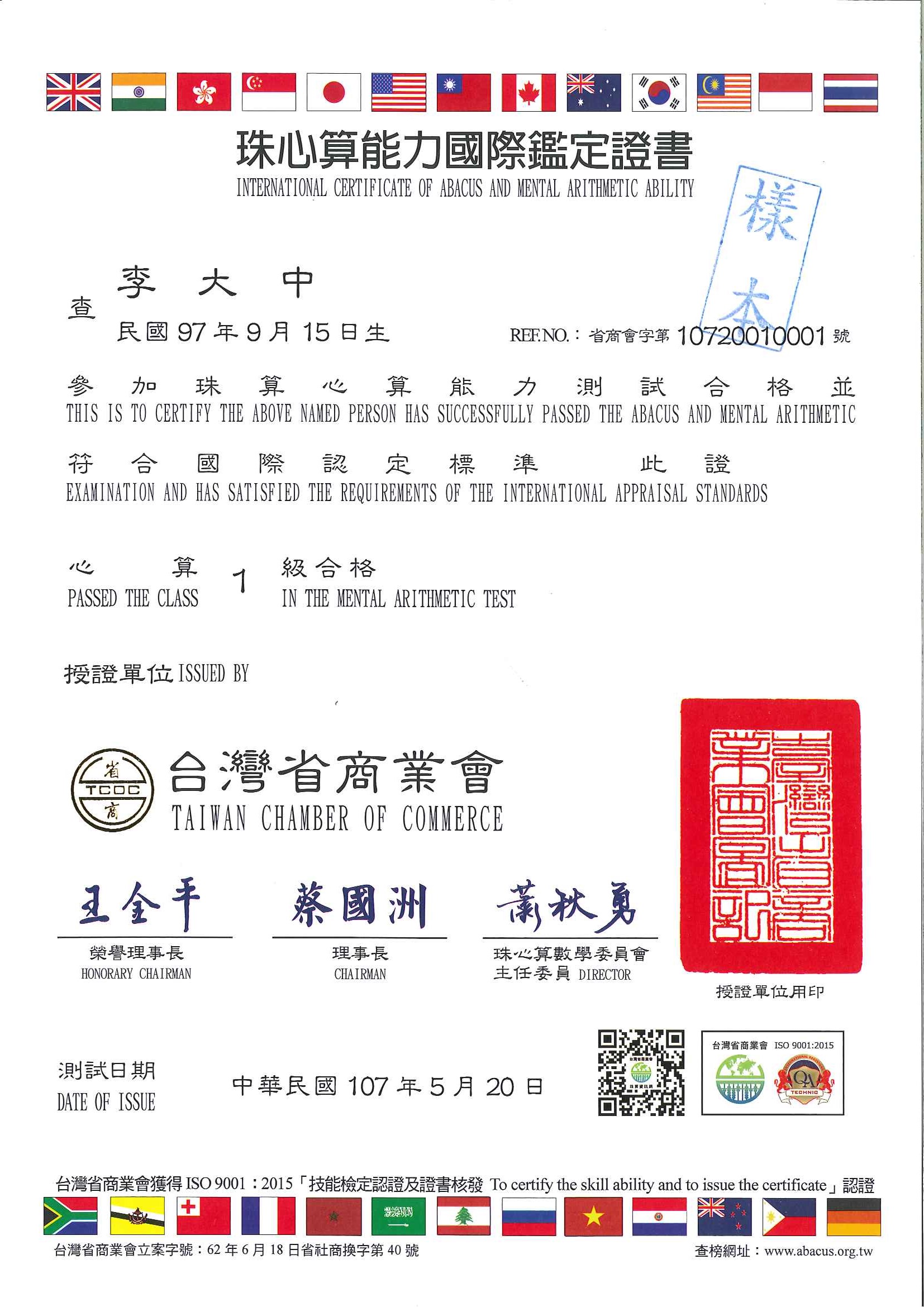 Our teacher is an official examiner and exam organizer in the UK for the Taiwan Chamber of Commerce (TCOC) for Abacus training, we organize international certificate exams regularly. All the test papers and the certificates will be issued directly from the TCOC to our centre.